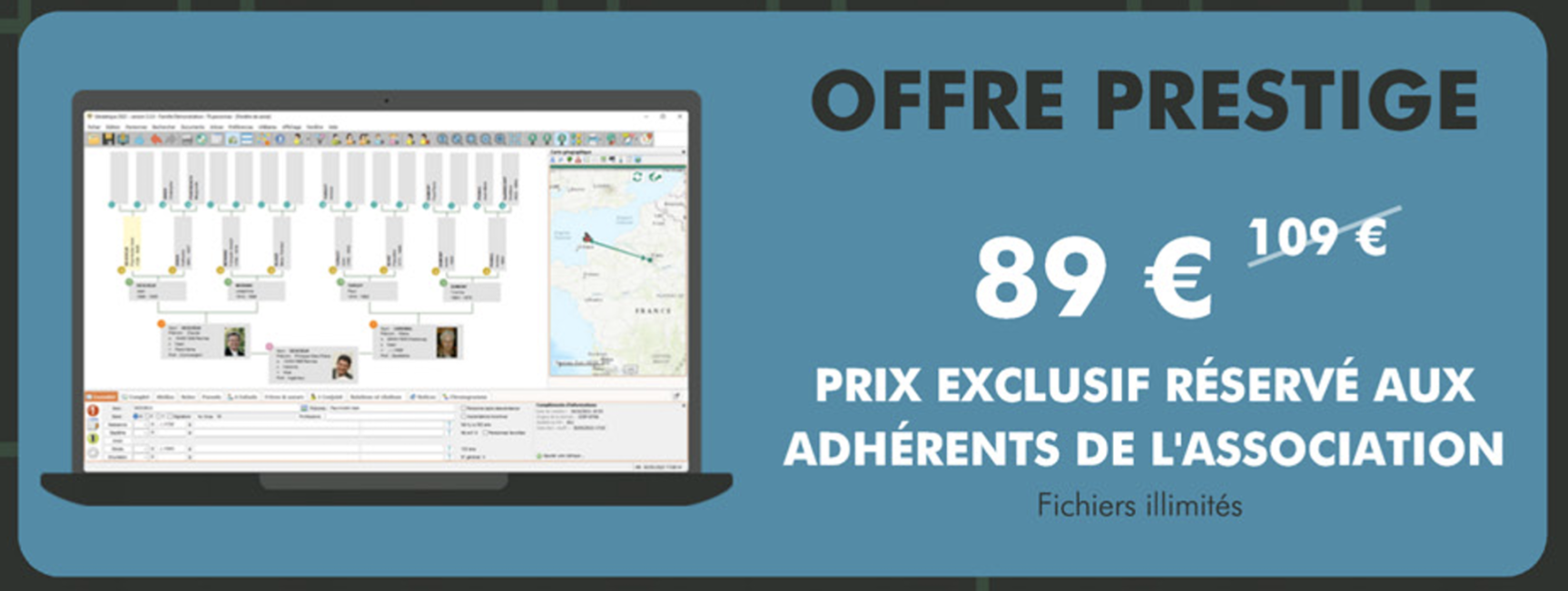Nos adhérents peuvent acheter le logiciel Généatique Prestige en téléchargement au tarif préférentiel de 89 € (pour en savoir plus sur Généatique, il suffit de télécharger le bon de commande).